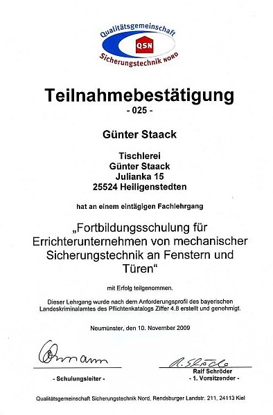 Wir sind Mitglied in der Qualitätsgemeinschaft Sicherungstechnik Nord (QSN). Die QSN ist Sicherheitspartner der Polizei in Sachen Einbruchprävention und anerkannter Schulungsanbieter für Errichterseminare.